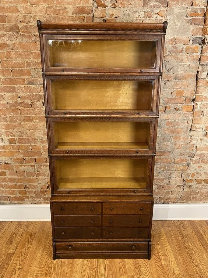 Early 1900s, American, from The Fred Macey Co. Ltd., Grand Rapids MI. Classic quarter sawn oak sectional barrister bookcase with rare original 6 drawer section. 7 pieces total including one base with drawer, one 6 drawer section with stepback to one 12" bookcase, two 10" bookcases, one 8" bookcase and top. Bookcase dimensions are interior height, all bookcases are 9.5" deep. In overall very good to excellent condition, including original finish, labels and glass. All original hardware is present including drawer pulls, side bands, door pulls and rare spring loaded retracting doors. Two small wood repairs to lowest bookcase door after door was improperly forced closed.