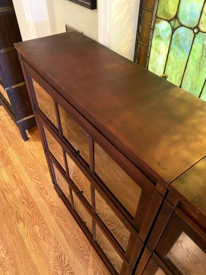 Early 1900s, mahogany, made by the The Macey Co, Grand Rapids MI. Two five piece stacking bookcases (10 pieces total), each stack including base, 13 inch bookcase, 11 inch bookcase, 9 inch bookcase and top. In a mission/arts and crafts style, in good condition with original glass and hardware, light wear to the top.