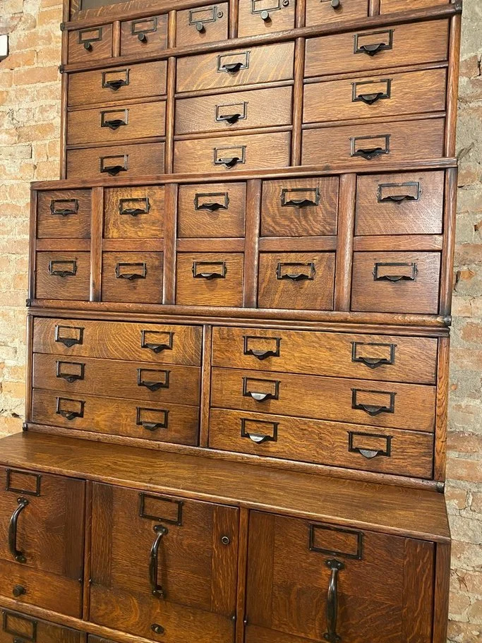 Early 1900s, American, from the Globe/Globe Wernicke Co., Cincinnati OH. Quartersawn oak sectional or stacking file cabinets and barrister bookcase combination. Nine pieces total, starting from the bottom, including leg base, 2 large file sections, 1 wide file section , 1 large index card section, 1 standard file section with paper holders, 1 small index card section, 1 barrister bookcase section, and 1 top. Large file sections include hinged tilting drawer fronts. In overall very good condition, with no common damage to the top. All sides are paneled except for the small file card section. Depth has a double stepback, which is a rare feature. Leg base likely not original, but appropriate in form and function. Original bases in this depth are very hard to find.