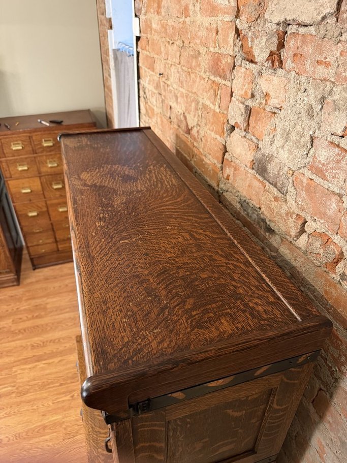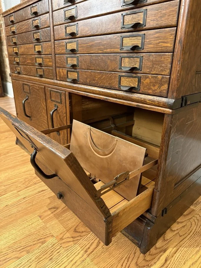 Early 1900s, American, from the Globe Wernicke Co., Cincinnati OH. Quartersawn oak sectional or stacking file cabinet, in the 299 style (quarter sawn oak, rich finish, brass oxidized hardware). Seven pieces total, starting from the bottom, including 1 base, 1 legal file section, 1 shallow/map drawer section, 1 vertical file section, 2 box file sections, and 1 top. Legal file sections include hinged tilting drawer fronts. Box file sections hold standard size paper and measure 8.75w x 11.5d. Boxes are made of a thick cardboard wrapped in a woven black covering. They are very sturdy and remain in very good condition for their age, with some having repaired/taped joints. Piece is in overall very good to excellent original condition, with original hardware and makers mark on the top. Some of the vertical file pulls may be period or modern replacements, and some honest wear to the top. Dimensions below for overall piece.