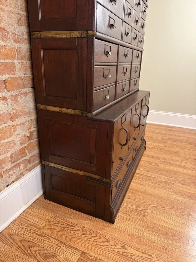 Early 1900s, American, from the Globe/Globe Wernicke Co., Cincinnati OH. A combination step back file cabinet with barrister bookcase sections, in the 598.5 style (solid mahogany with brushed brass sidebands). 7 pieces in total, starting from the bottom, including one 2 drawer base section, one 3 drawer standard file section, one 9 drawer letter file section with suspending devices, one 12 drawer catalog section, two barrister bookcase sections, and one top. Standard file drawers have tilt out fronts, letter file drawers all suspend downward to allow hands free access to the drawer, and catalog drawers have side cut outs for easy access to contents or use as a desktop paper tray. Cabinet is in good to very good original condition, and includes original pulls, finish, hardware, and some of the original GW record transfer sheets. Barrister glass likely replaced at some point, and some damage to the rear of the base sides with replaced base back panel. Dimensions below for the overall piece.