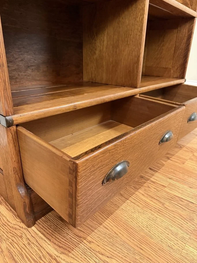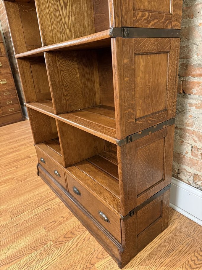Early 1900s, American, from the Globe Wernicke Co., Cincinnati OH. A very rare four stack open case barrister bookcase, in the extra wide size. In the 299 style (solid quarter sawn oak, oxidized brass hardware). 6 sections total, including rare drawer base, four 12.25" bookcases, and top. Bookcase interiors measure 12"d x 12.25"h. In overall excellent original condition, including original finish and and hardware.